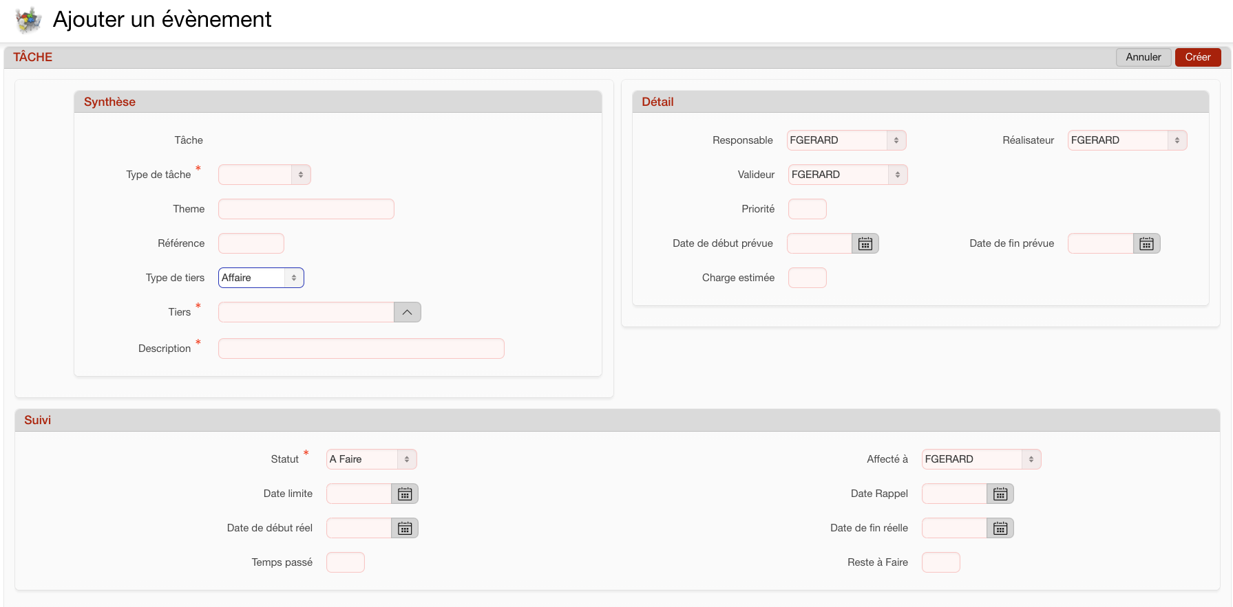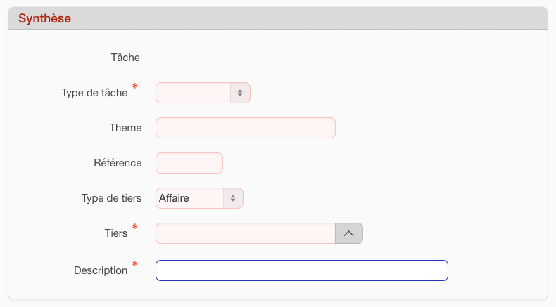 Type de tâche: Cette liste déroulante de choix comporte les types de tâches qui ont été préalablement établis dans “Système > Paramétrage > Liste de Valeurs”: