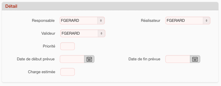 Date début prévue / Date de fin prévue : Date au format JJ-MM-AA (ou choix depuis le bouton calendrier),