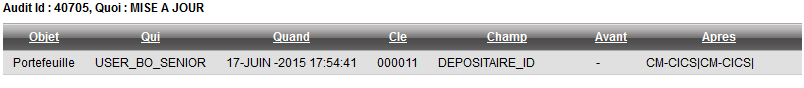 Cet écran est généralement rattaché aux pages de modifications de données pour pouvoir consulter l'audit associé. Voici un exemple de cet écran s'il est appelé grâce au bouton 'Audit' de la page 'création/modification d'un portefeuille'.