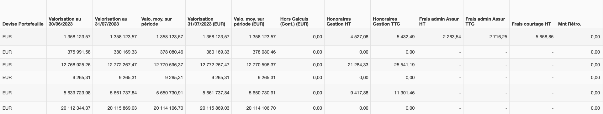 La colonne “Valo. moy. sur période (EUR)” affiche le calcul de la valorisation moyenne convertie en Euro, sur la période. Lorsque la devise du portefeuille est l'Euro, ce montant est identique à la valorisation moyenne de la période.