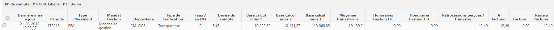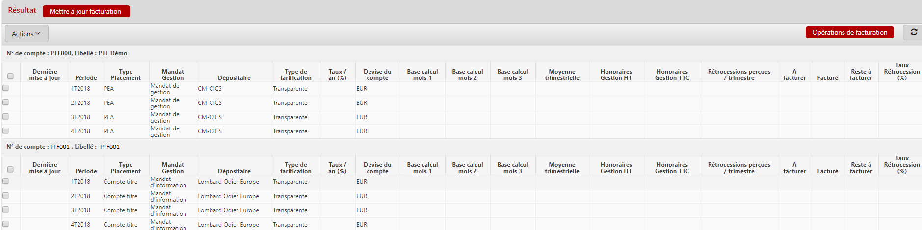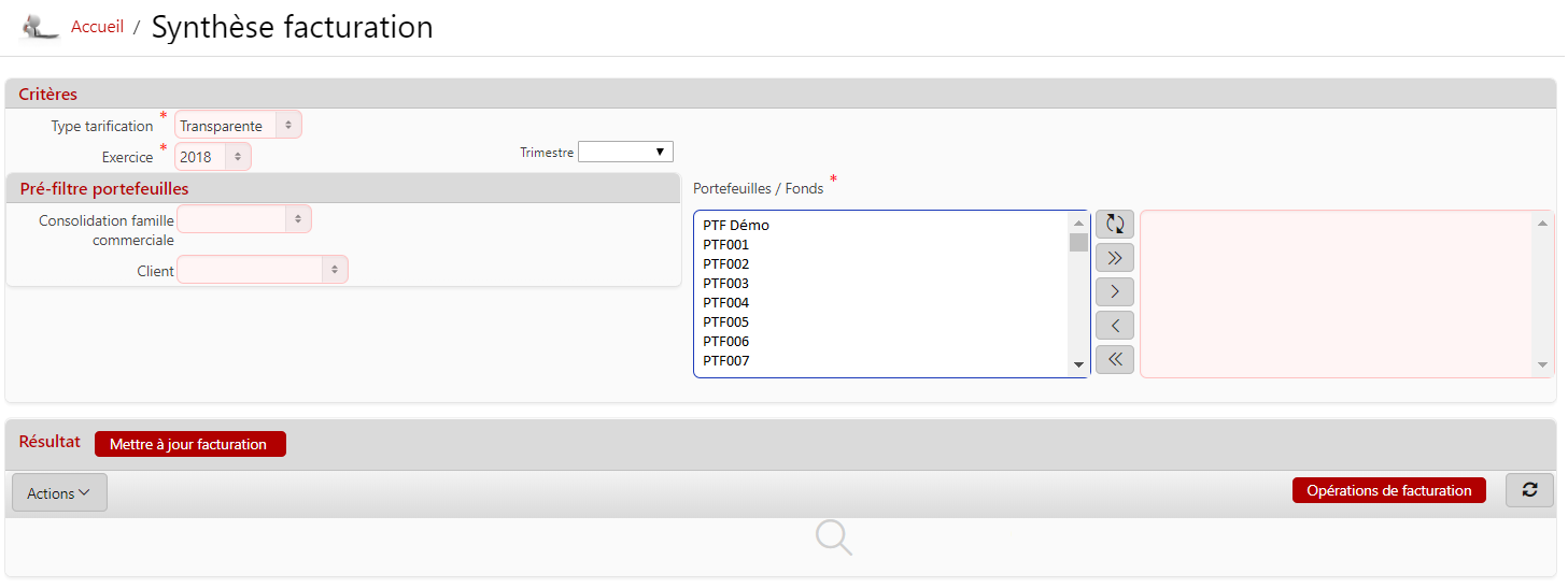 Description de l'écran : Cet écran permet de visualiser l'historique des factures émises sur chaque portefeuille et sur une période donnée, et d'effectuer les opérations de facturation.