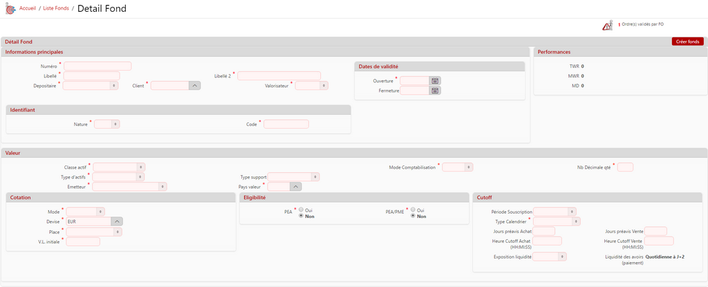 Pré-requis: Pour créer un fond, il est nécessaire de créer au préalable l'émetteur / client et le dépositaire / valorisateur du fond - qui peuvent être une seule et même organisation- (voir