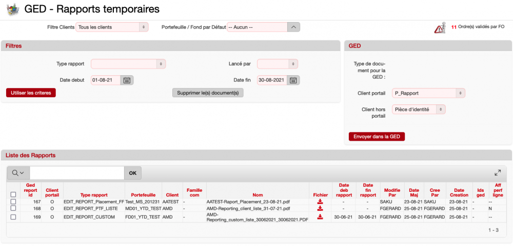 Puis on valide l'envoi vers la GED (suivant les types de rapport définis dans le cadre GED) en cliquant sur “Envoyer dans la GED”.