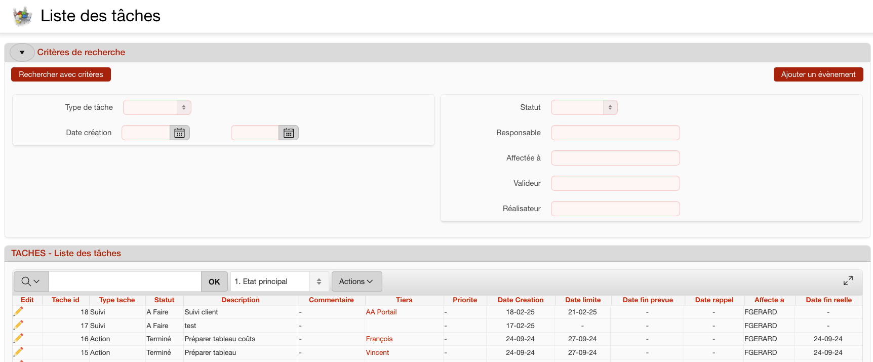 Les types de tâches: Cette liste déroulante de choix comporte les types de tâches qui ont été préalablement établis dans “Système > Paramétrage > Liste de Valeurs”: