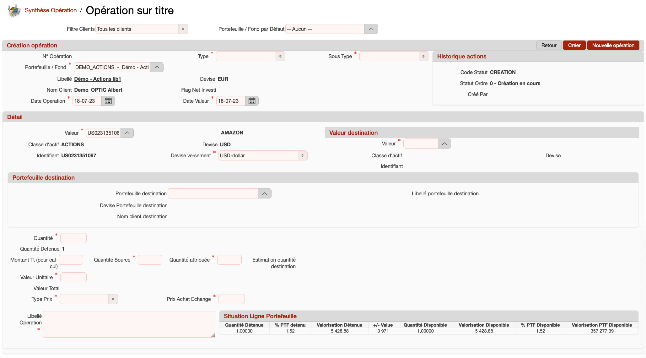Description de l'écran : il permet de créer une opération sur titre pour un portefeuille.