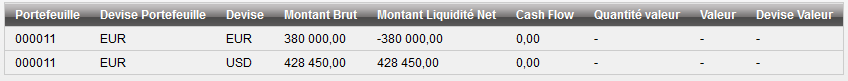 La colonne “Cash Flow” affiche la valeur prise en compte pour le calcul des performances alors que les autres colonnes affichent l'impact de cette ordre sur le portefeuille.