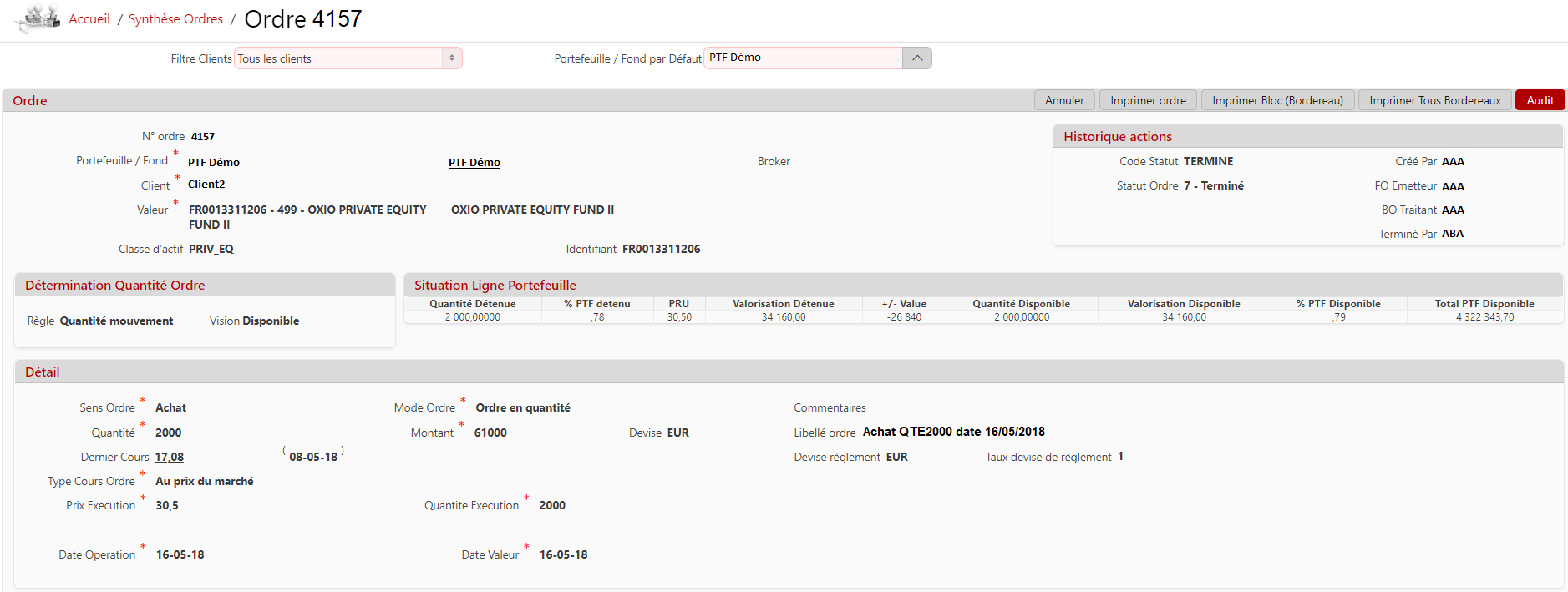 Description de l'écran : il permet de consulter un ordre dans son état final.