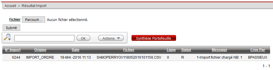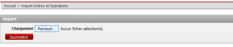 Pour importer des ordres et opérations grâce à un fichier, il faut le sélectionner grâce au bouton 'Parcourir..' qui ouvre un explorateur de fichiers puis lancer l'importation grâce au bouton 'Soumettre'.