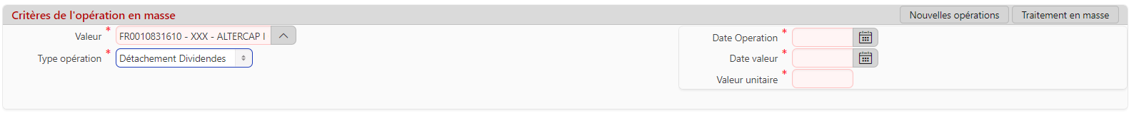Voici les champs du formulaire disponibles quand “Détachement coupons” ou “Détachement dividendes” est sélectionné :