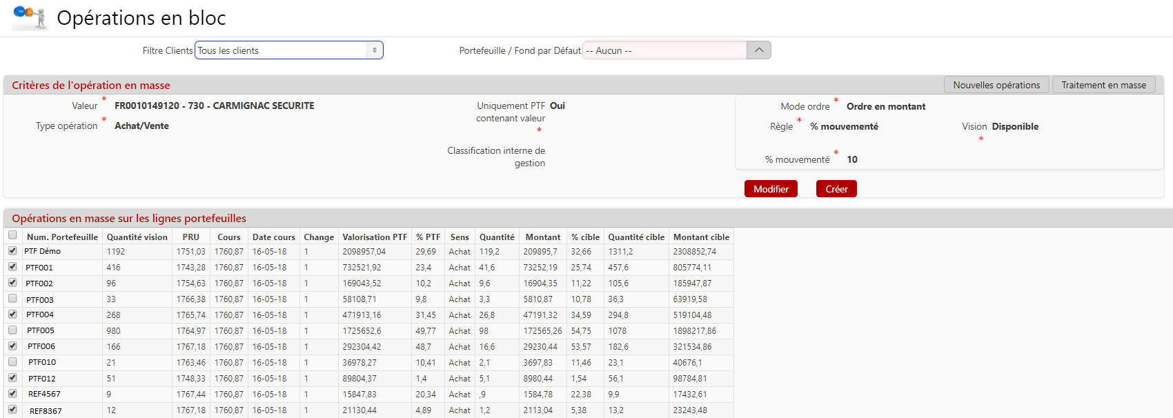 Par défaut, toutes les lignes des portefeuilles trouvées sont cochées, on peut déselectionner des lignes pour ne choisir que les lignes que l'on souhaite traiter.