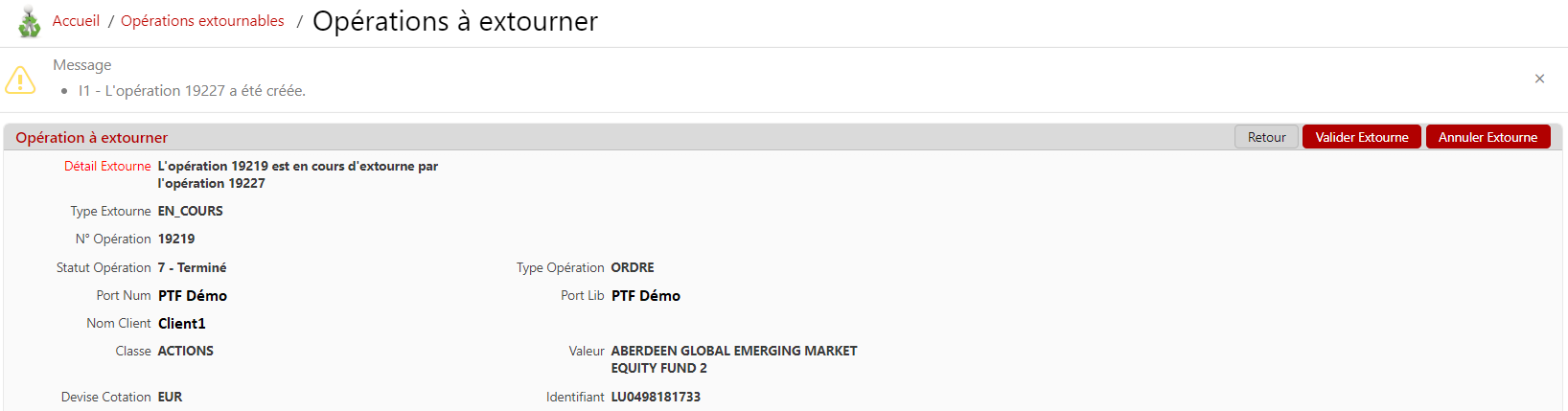Pour finaliser la création de l'extourne avec un ordre extournant au statut 'SAISI', cliquez sur le bouton 'Créer Extourne'.
