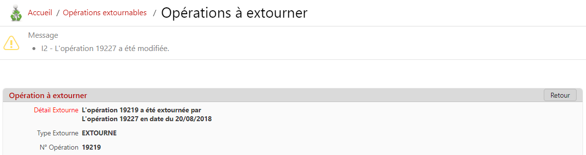 Message confirmant la validation de l'extourne : l'opération d'extourne a été créé et le type est passé de “EN_COURS” à “EXTOURNE”.