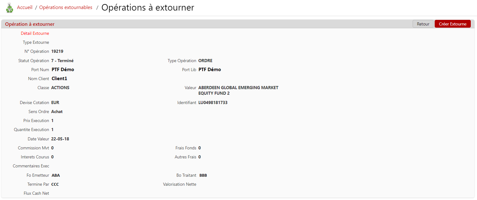 Description de l'écran : il permet de visualiser le détail d'un ordre ou d'une opération et, selon soit de créer l'opération d'extourne, soit de valider une opération déjà créée.