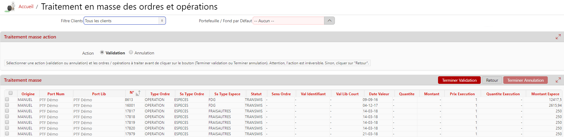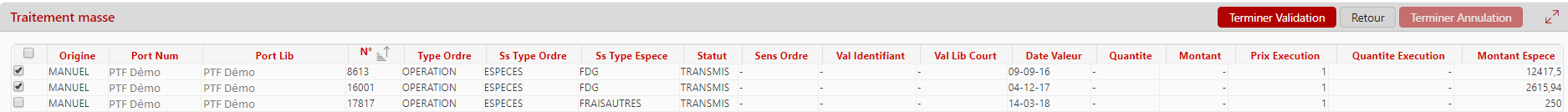 Il permet ici de préciser pour quel portefeuille vous souhaitez terminer / annuler des ordres et opérations associés.