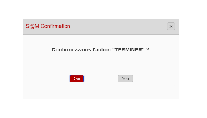 L'aperçu ci après présente l''action de 'Terminer Validation'. l'écran pour 'Terminer Annulation' est similaire.