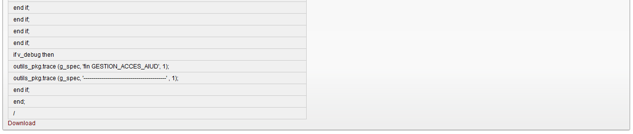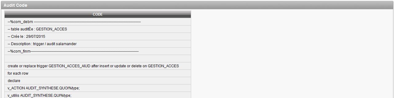 Description de l'écran : il permet de visualiser le code du trigger pour un table et de pouvoir le télécharger.