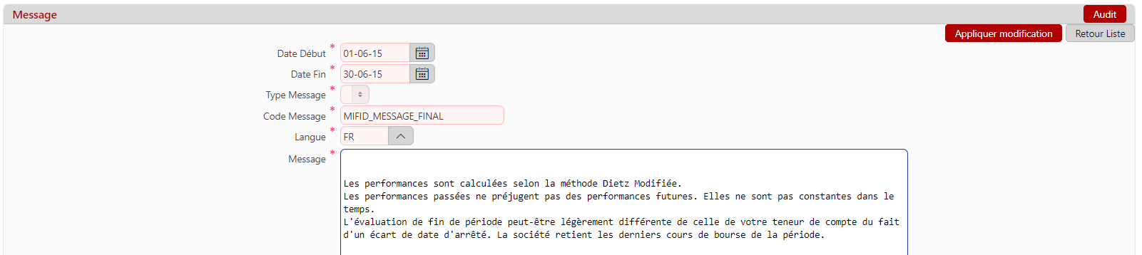 Toutes les caractéristiques d'un message qui sont décrites dans la partie création d'un message ci dessus peuvent être modifiées. Cela comprend aussi les dates, si l'on souhaite réutiliser un message pour un rapport sur une autre période.