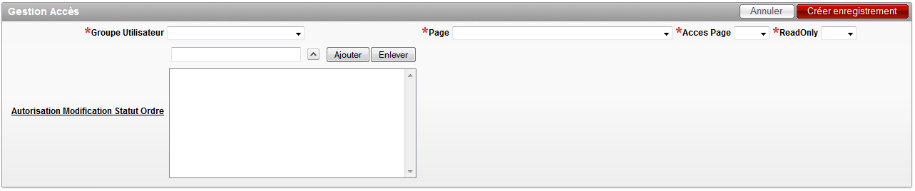 La page 50 (création/modification d'un ordre) et 53 (création/modification d'une opération) présente un autre contrôle afin qu'un groupe d'utilisateurs puisse modifier l'ordre/opération. Il est possible de modifier l'ordre/opération si le champ “Autorisation Modification Statut Ordre” contient le statut dans lequel se trouve l'ordre/opération. Pour remplir ce champ, il faut sélectionner un statut grâce au champ situé au-dessus de ce dernier et cliquer sur le bouton “Ajouter”.