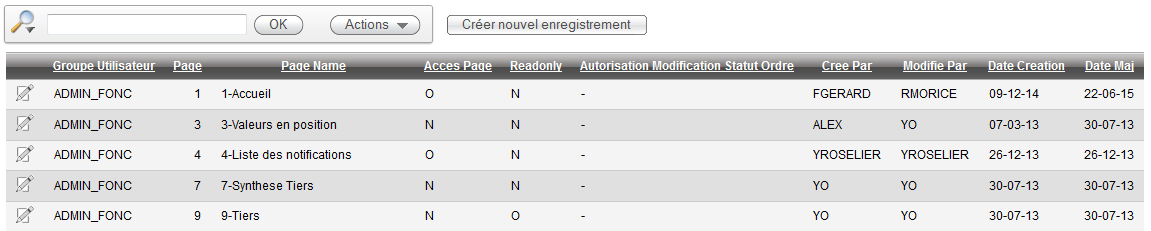 Ce rapport affiche tous les accès des pages de l'application. En cliquant sur l'icône de la première colonne, le formulaire de la page se remplit avec les données de la ligne. Il est possible de modifier cet accès en cliquant sur le bouton “Appliquer modification”.