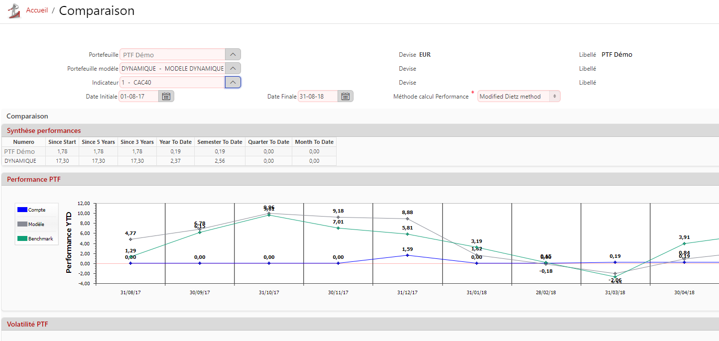 Description de l'écran : Cet écran permet de comparer la performance d'un portefeuille avec celles d'un portefeuille modèle et d'un indice de référence.