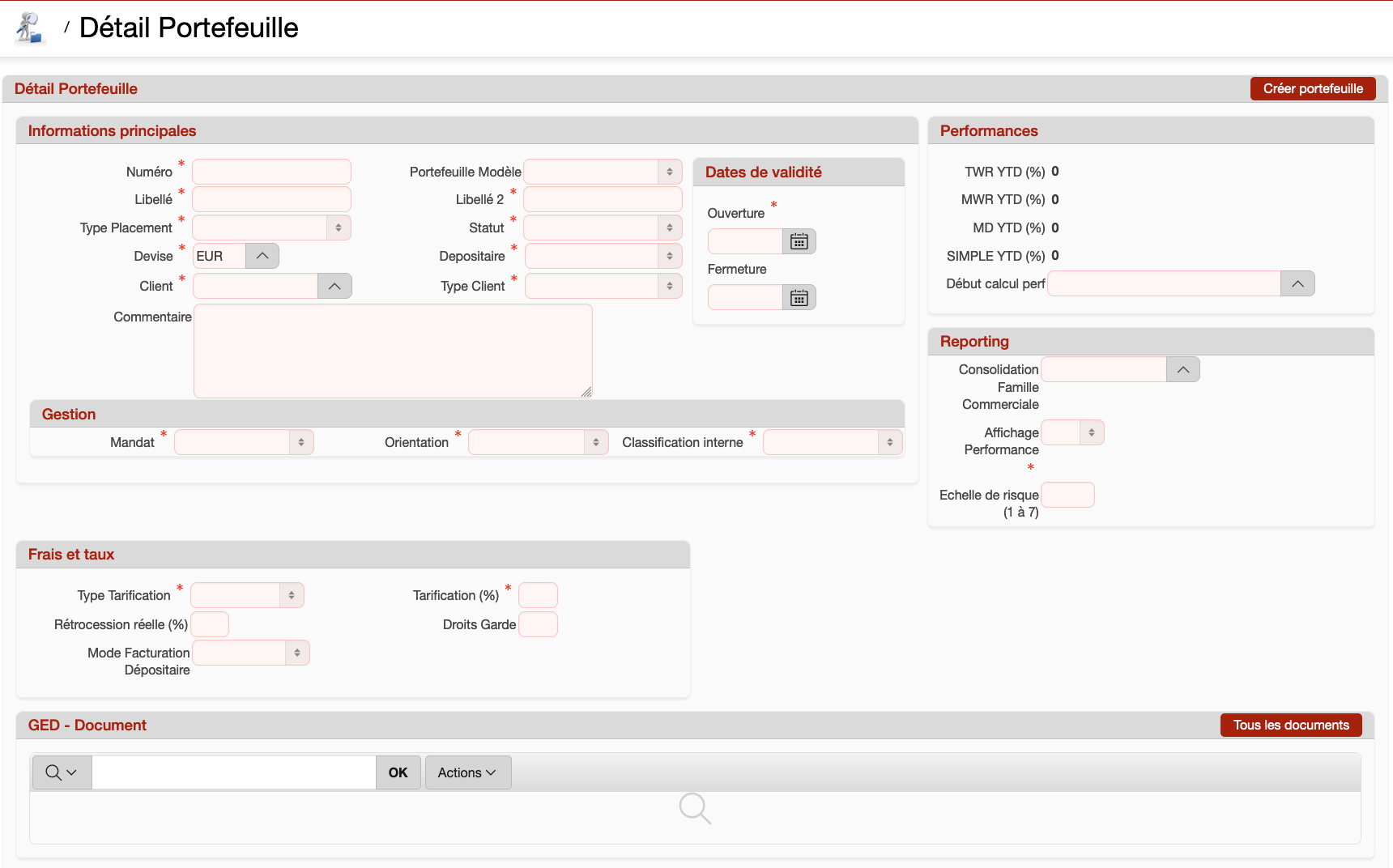 Pré-requis: Pour créer un portefeuille, il est nécessaire de créer au préalable le client, le dépositaire et l'assureur (voir