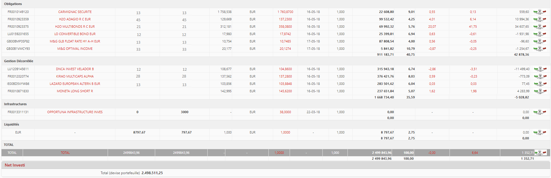 Vous pourrez par exemple visualiser la valorisation du portefeuille ou encore le pourcentage que possède cette ligne sur le montant total du portefeuille.