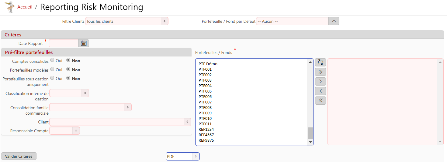 Ecran de validation des critères avant génération du rapport :