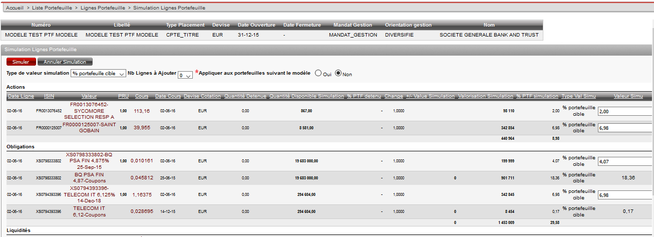 Description de l'écran : Il permet de simuler des modifications et ajouts de lignes pour un portefeuille sélectionné. Dans le cas d'un portefeuille modèle, l'écran permet de propager les modifications sur les portefeuilles qui y sont rattachés.