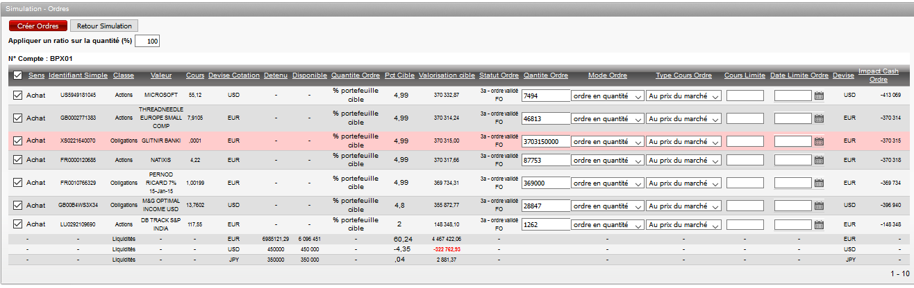 La console présente tous les ordres d'achat ou de vente à exécuter pour atteindre l'objectif fixé lors de la simulation.