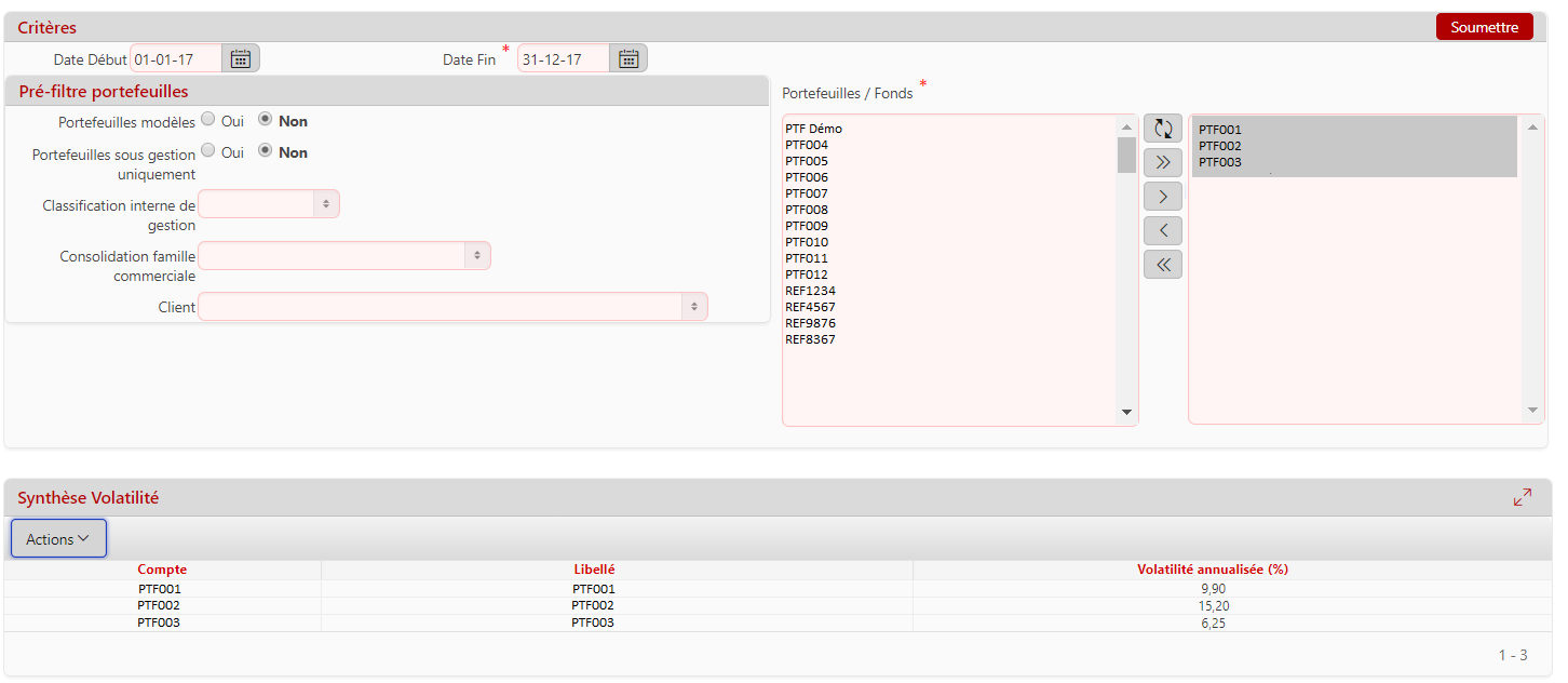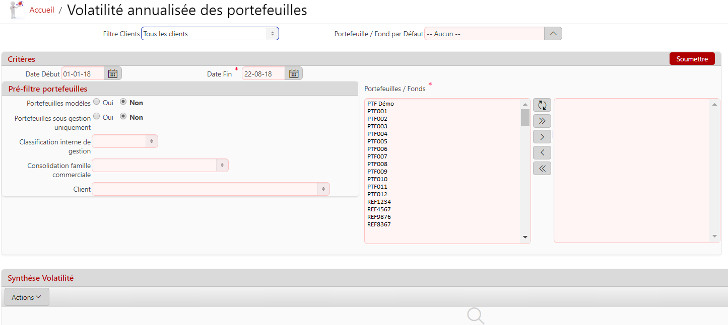 Description de l'écran : Cet écran permet de consulter la volatilité annualisée des portefeuilles.