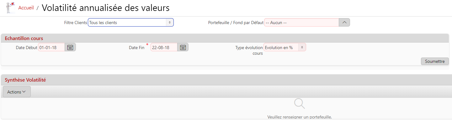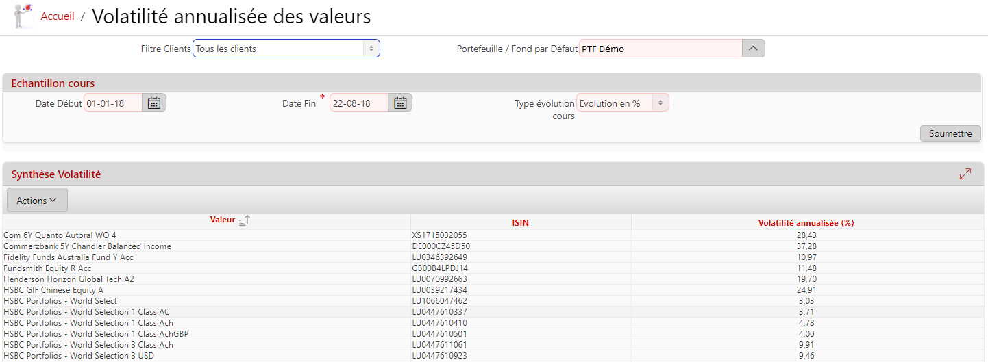 Description de l'écran : Cet écran permet de consulter la volatilité annualisée des valeurs.