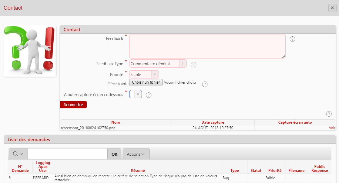 un champ “Feedback Type” : permet de sélectionner le type de la demande (commentaire, demande d'amélioration, bug).