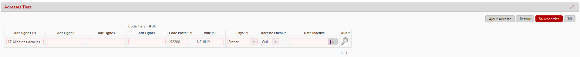 Ce rapport affiche les adresses du tiers. Il est possible d'apporter des modifications sur ces lignes ainsi que d'en rajouter grâce au bouton “Ajout Adresse”. Pour valider les modifications, il faut cliquer sur “Sauvegarder”.