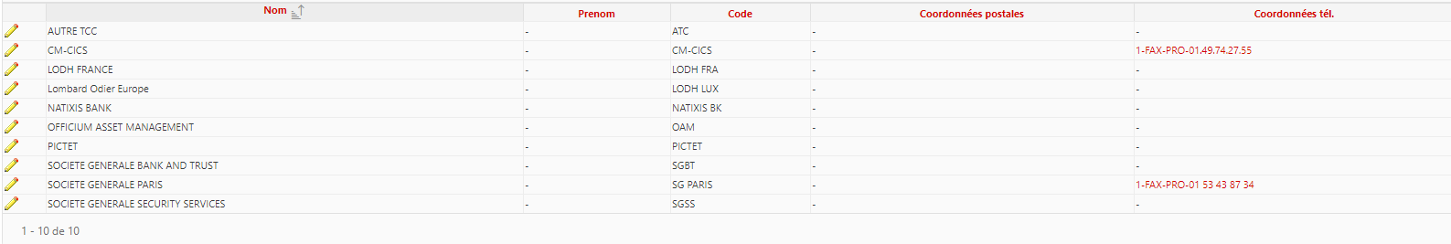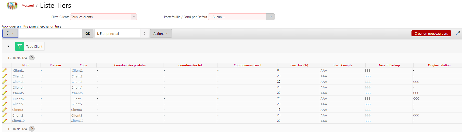 Ce tableau permet de visualiser les différents tiers. Le nombre de colonnes et de lignes affichées dépend de votre recherche : voir comment utiliser la barre de recherche.