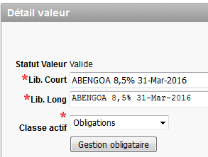 Pour utiliser des valeurs de type obligation avec calcul de coupon dans S@M, la valeur doit avoir un code classe “OBLIGATIONS” et un type d'actifs “OBLIG”.