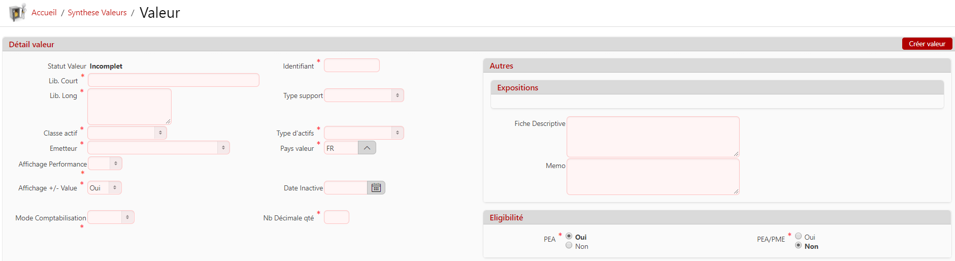Afin de créer une nouvelle valeur, il faut renseigner tous les champs avec un astérisque rouge qui sont obligatoires.