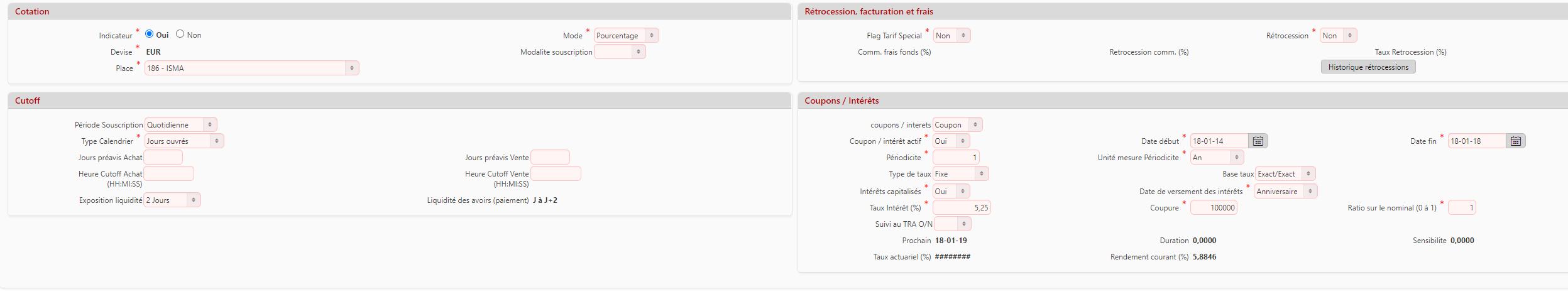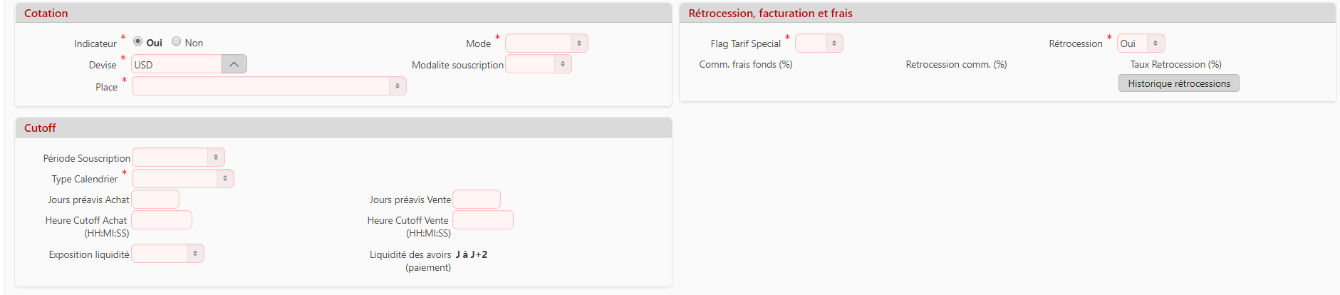 L'indicateur de Retrocession (Oui / Non): indique si une Commission sur encours est applicable à cette valeur. S'il existe une commission (Oui) alors il est nécessaire de renseigner les informations complémentaires suivantes