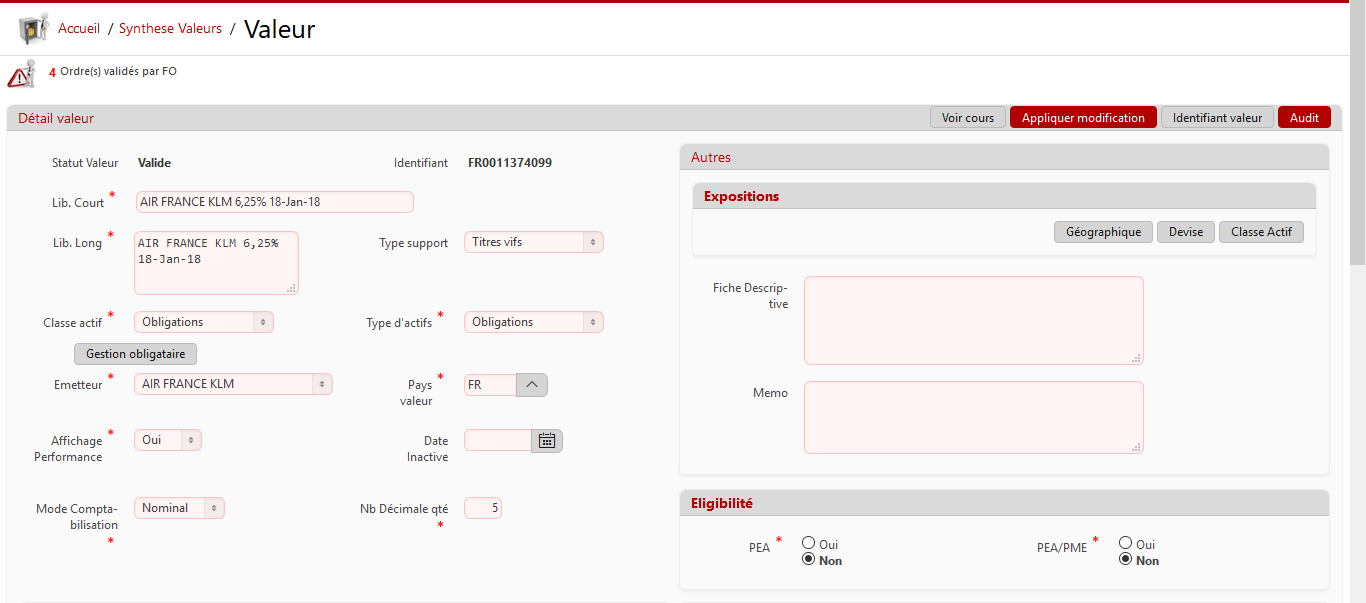 Le formulaire contient des informations qui permettent de classifier la valeur en fonction de sa nature et qui sont utilisées pour définir différents types de répartitions des valeurs dans les portefeuilles. Ces répartitions sont calculées dans le reporting global.