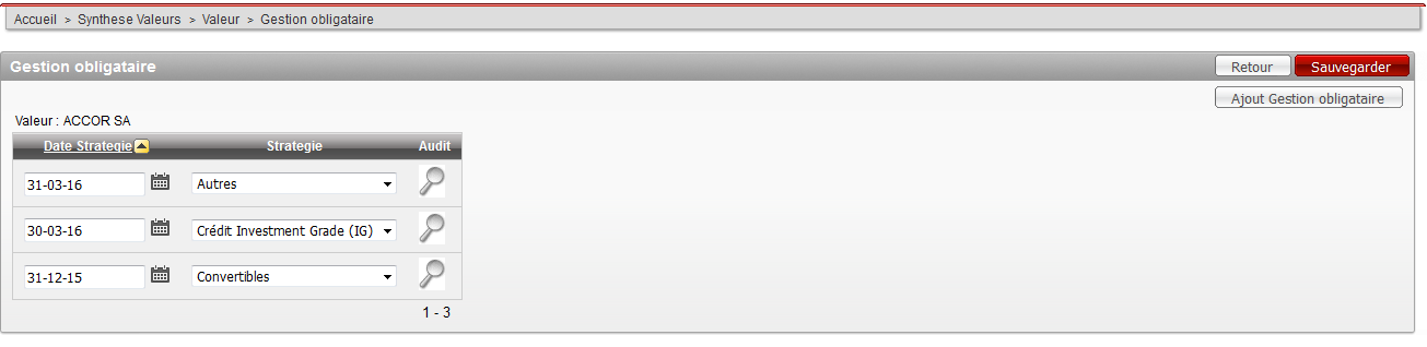 Description de l'écran : il permet de créer ou modifier la stratégie de la gestion obligataire pour une valeur sélectionnée.