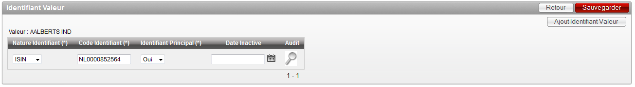 Description de l'écran : il permet de visualiser l'ensemble des identifiants d'une valeur. Cet écran est aussi utilisé pour ajouter, modifier ou encore désactiver un identifiant.