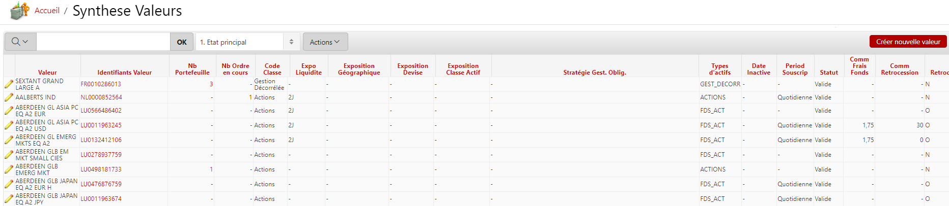 Ce rapport affiche les principales informations relatives aux valeurs. Vous avez la possibilité de modifier l'aspect de ce rapport en utilisant les possibilités de la barre de recherche avec la fonction Sélectionner colonnes.